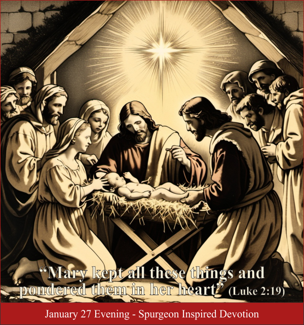 The shepherds told Mary what the angel said: “I bring you good tidings of great joy which will be to all people. For there is born to you this day in the city of David a Savior, who is Christ the Lord” (Luke 2:10-11). Mary did three things with the announcement of the angel and the miracles of the incarnation: she treasured the words in her mind, she felt the memories in her heart, and pondered the significance of the miracles in her deepest being, Memory, affection, and understanding were all engaged with the things she heard and experienced because of her newborn Son. Beloved, remember what you’ve heard of the Lord Jesus Christ and make your heart a treasure chest to preserve what God has personally done for you. Let your memory store every thought, feeling, experience and belief, and let your affections be lavished upon Him for evermore.