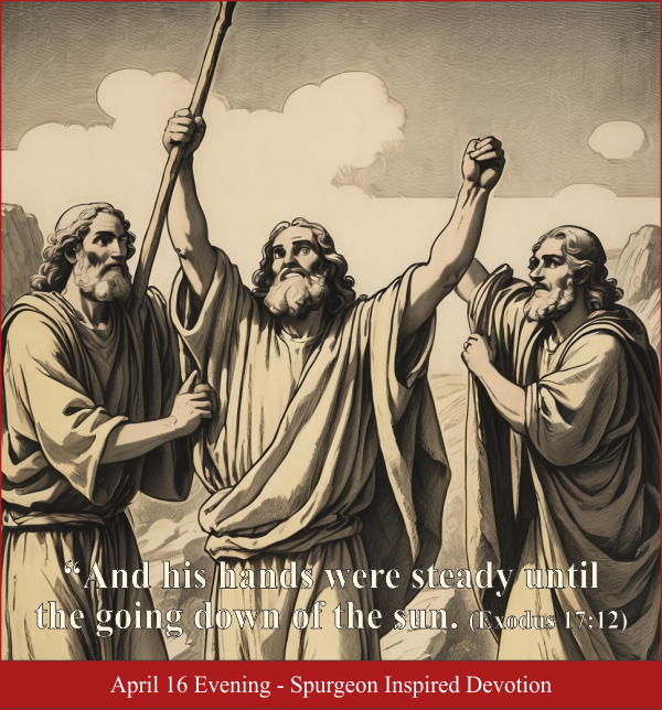 When Moses grew weary, his friends helped him. When you grow weary in prayer, let faith support one hand, and holy hope the other, and pray resting on the Stone of Israel, the Rock of our salvation, and you will persevere and prevail. Beware of faintness in devotion; if Moses felt it, you can be sure you will too. It’s far easier to fight with sin in public, than to pray against it in private. It’s remarked that Joshua never grew weary in the fighting, but Moses grew weary in the praying; the more spiritual an exercise, the more difficult it is for flesh and blood to keep going. Let’s cry, then, for special strength, and the Spirit of God, who helps our infirmities, will enable us to continue with our hands steady "until the going down of the sun"; that is, till our life is over; till we come to Heaven, where prayer is swallowed up in praise.