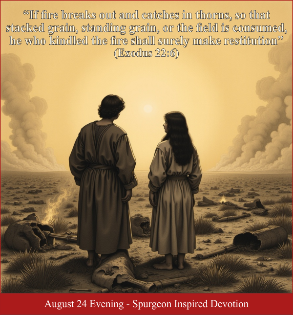 “If fire breaks out and catches in thorns, so that stacked grain, standing grain, or the field is consumed, he who kindled the fire shall surely make restitution” (Exodus 22:6)