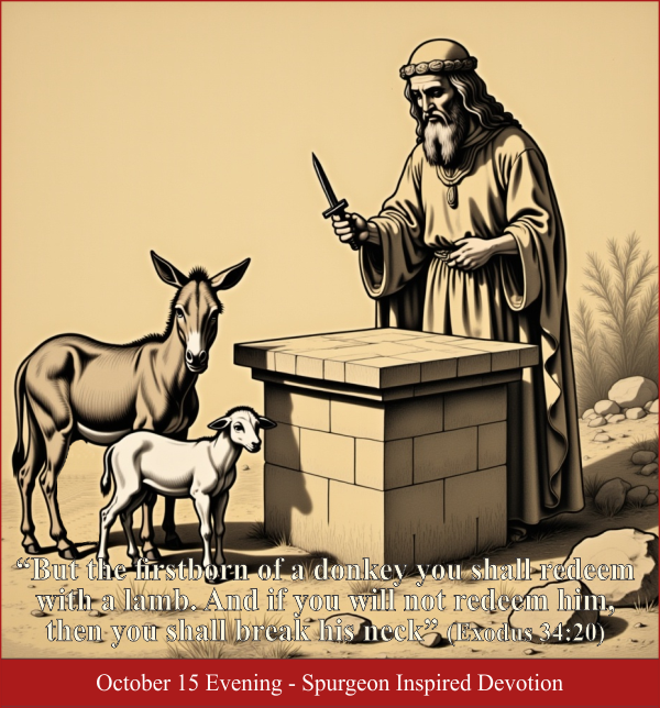 This, of course, speaks of our need of Christ. That unclean animal is you; you are the property of the Lord who made you and preserves you, but you are so sinful that God will not, cannot, accept you; and it has come to this, the Lamb of God must stand in your stead, or you will die eternally.