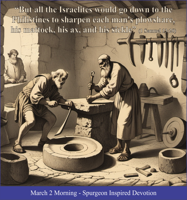 “But all the Israelites would go down to the Philistines to sharpen each man's plowshare, his mattock, his ax, and his sickle” (1 Samuel 13:20)