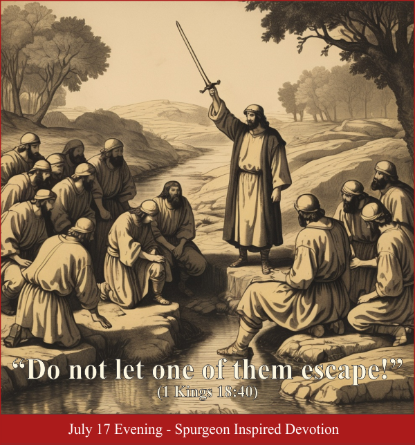 When the prophet Elijah’s request was granted, and fire came down from Heaven to consume the sacrifice in the presence of all the people, he called upon the assembled Israelites to seize the priests of Baal, and cried, “Do not let one of them escape!”. He took them all down to the brook Kishon, and slew them there. So must it be with our sins…they should all be put to death. Even your darling sins must die. No matter how loudly they cry, “spare me!”, Strike, though they are as dear to you as Isaac was to Abraham.