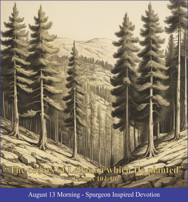Lebanon's cedars are emblematic of the Christian, in that they owe their planting entirely to the Lord. This is true of every child of God. He’s not man-planted, or self-planted, but God-planted. The mysterious hand of the Holy Spirit drops a living seed into a heart which He’s prepared for its reception. Every true heir of heaven recognizes God as his planter. Moreover, the cedars of Lebanon were not dependent upon man for their watering; they stood on rocks, without human irrigation, and our heavenly Father supplied them.