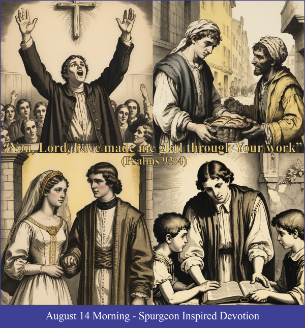 Your “righteousness and peace and joy in the Holy Spirit” will make you a good witness (Romans 14:11). Cheerful holiness is the most effective sermon, but the Lord must give it to you. Seek it this morning, before you go into the world. When we do the Lord's work, there’s no limit to our joy.